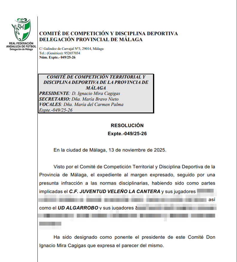 Finalmente, el «Comité de Competición y Disciplina Malagueño», ha hecho oficial la resolución y pertinente sanción tras los hechos ocurridos. «El artículo 83 del Código de Justicia Deportiva expone que se sancionará con suspensión de uno a tres años al/a la que agrediese a otro/a llevando a cabo la acción con inequívoco propósito de causar daño y originando el hecho lesión de especial gravedad, tanto por su propia naturaleza como por el tiempo de baja que suponga. »