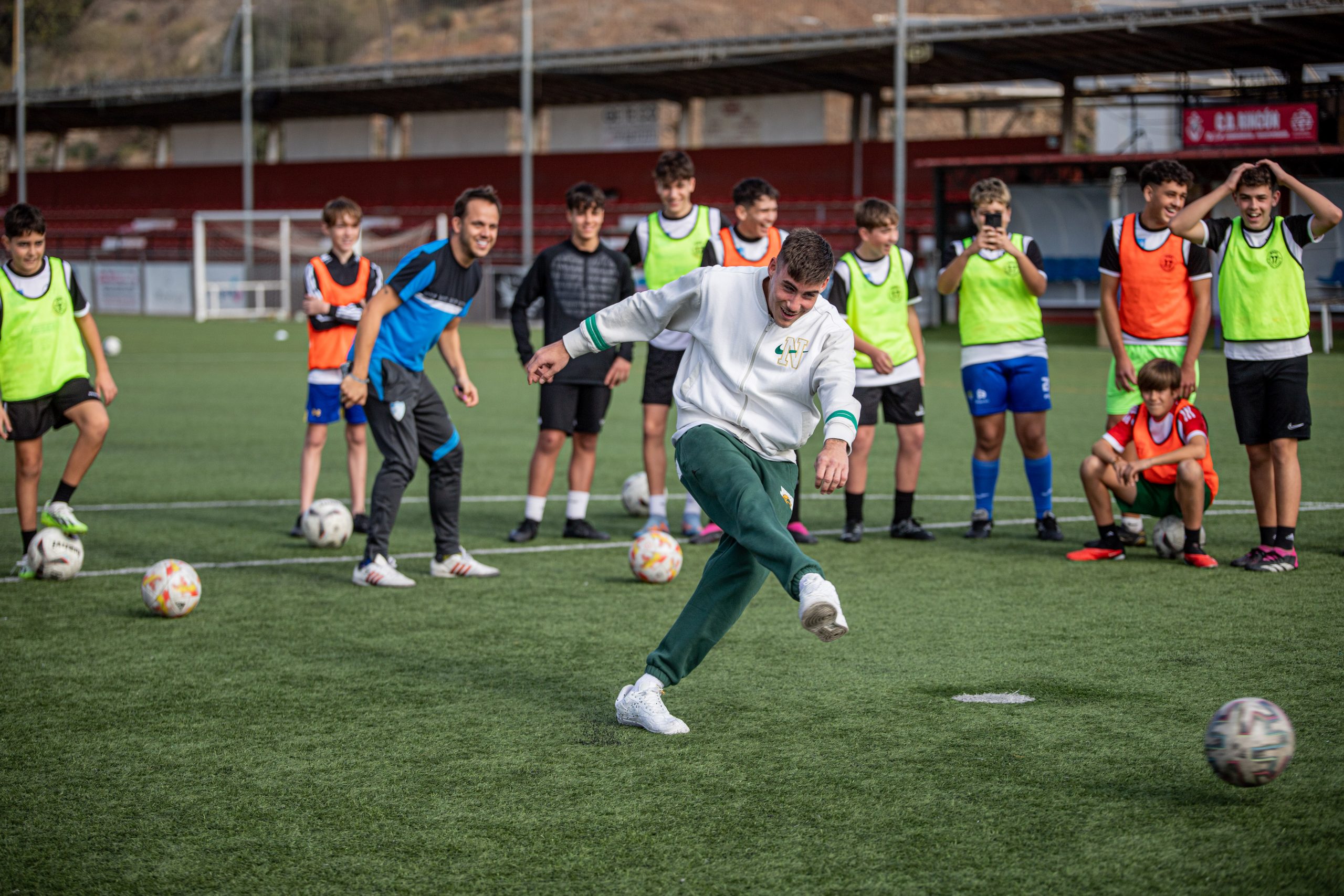 Los futbolistas malaguistas se atrevieron a lanzar los famosos ‘penaltis mareados’ junto a los asistentes al campus, que contó esta mañana con la presencia del humorista Tomás García y el influencer BadCharly. Hubo tiempo para unas risas entre los presentes, con la dificultad de lanzar un penalti mareado. Roberto, Kevin o Larrubia fueron los más decididos a la hora de lanzar, aunque con poca fortuna de cara al gol. Los niños pudieron sacarse fotos con los jugadores presentes y conocerlos un poco más a lo largo de la mañana. Además ayer, el Málaga Genuine participó realizando varios partidos de entrenamiento contra los asistentes.