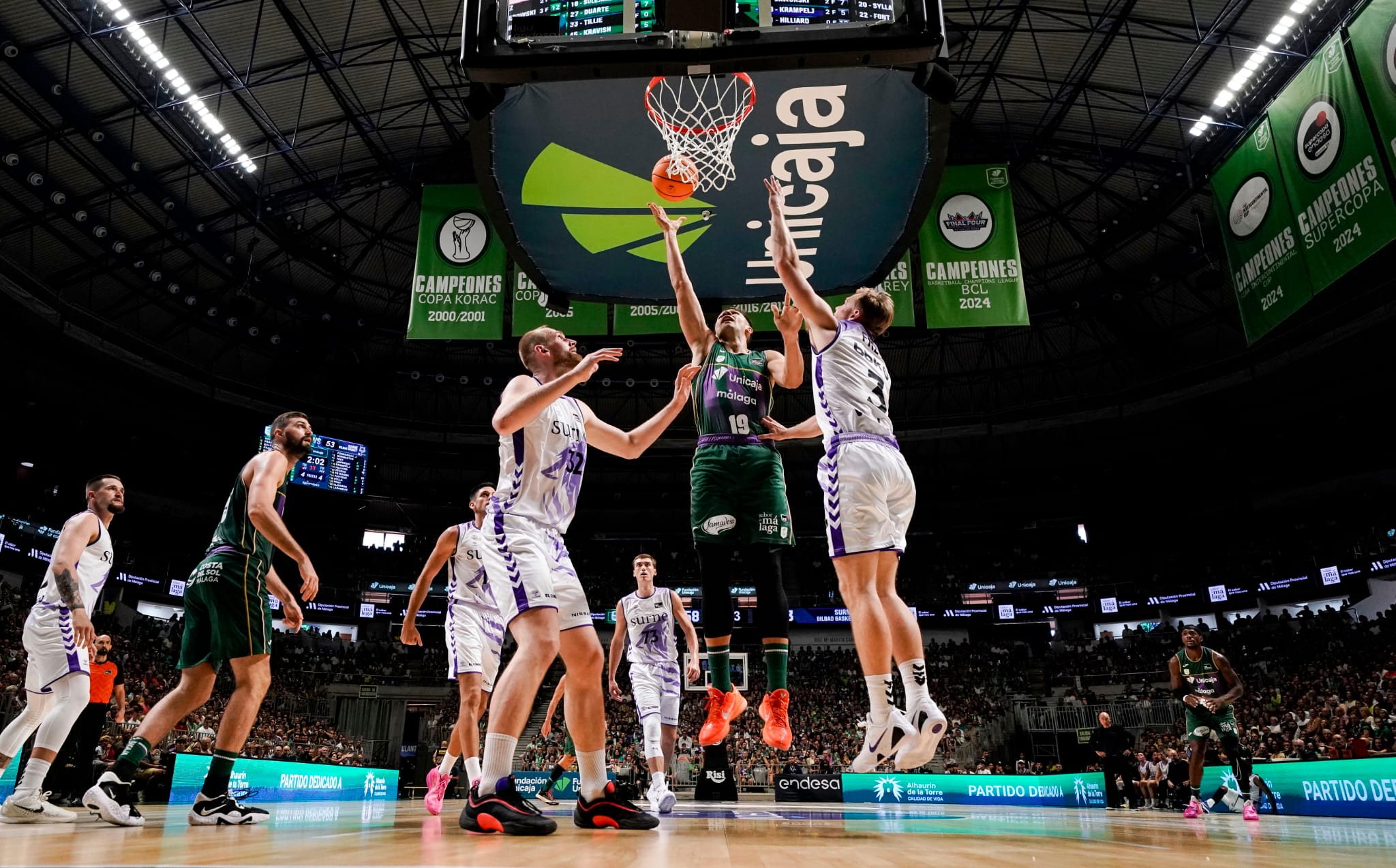 Pese a ello, el ciclón de los malagueños fue brutal, con triples y acciones de transición que abrieron la brecha hasta llegar a los 12 puntos de ventaja, gracias a un triple de Olek que hizo que el Carpena se viniera abajo (39-27). Los últimos minutos del segundo cuarto fueron igualados, con un Surne Bilbao Basket que trató de bajar la distancia, pero que gracias al triple de Djedovic se mantuvo en 12 puntos para finalizar los primeros veinte minutos de juego (46-34). El máximo anotador de Unicaja al descanso fue Olek Balcerowski con 8 puntos, mientras que Hilliard fue el más destacado con 9 puntos para los vascos.